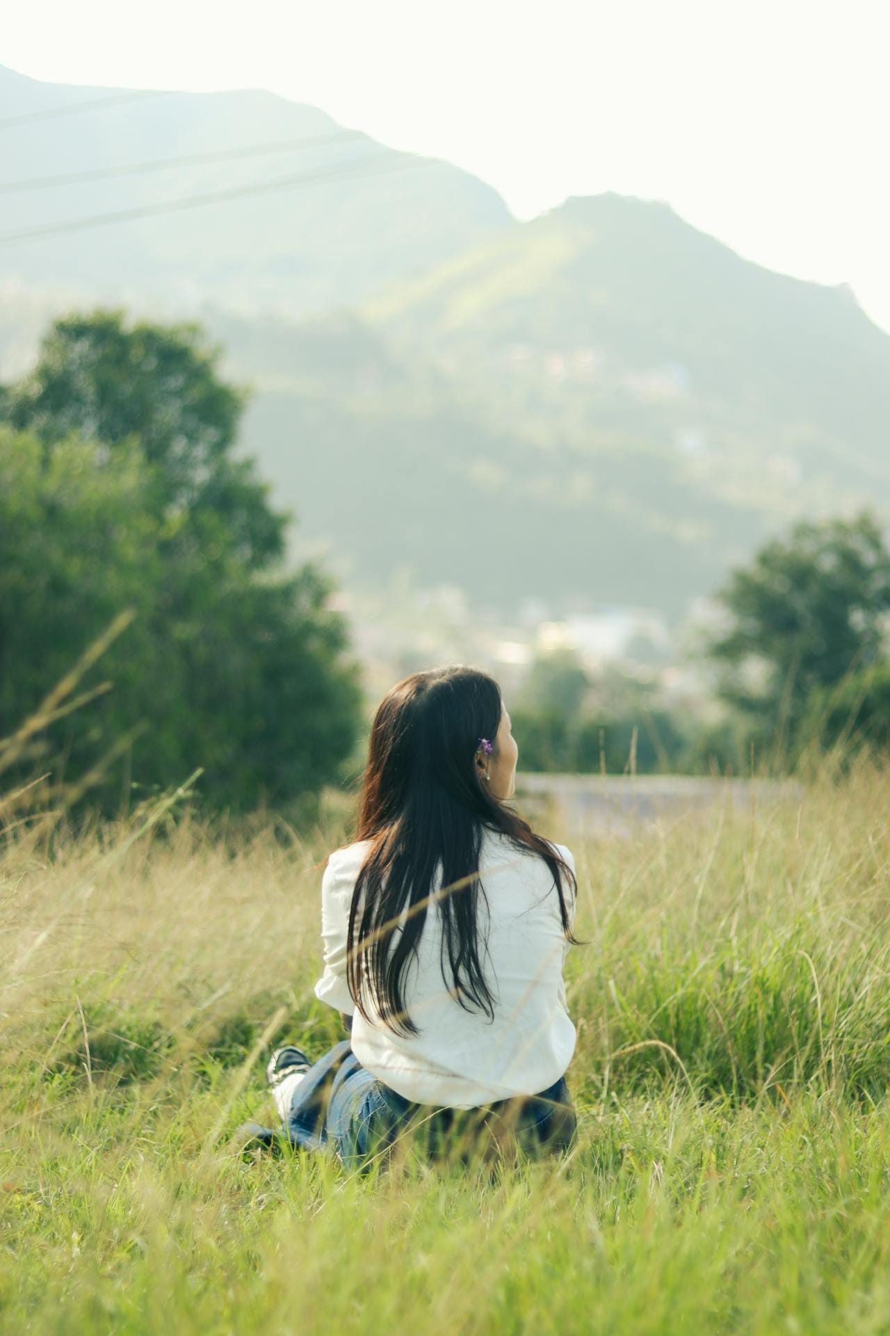 Photo of a person with dark long hair, in the grass facing the mountains with their back to us, by Badri Rai from Pexels